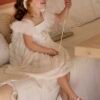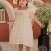 Φόρεμα Βάπτισης Baby Bloom από ανάγλυφη βαμβακερή δανδέλα με εσωτερική επένδυση μαλακό βαμβακερό ύφασμα , πλούσιο τούλινο μανικάκι με κρόσια που καλύπτει τον ώμο του παιδιού . Τη μέση του φορέματος στολίζει μια χειροποίητη σύνθεση λουλουδιών . Ασορτί τούλινη κορδέλα και κατ’ επιλογή μπαντάνα ή τουρμπάνι .