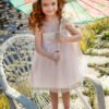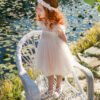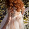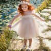 Νεραϊδένιο φόρεμα βάπτισης που το χαρακτηρίζει η ιδιαίτερη ανάγλυφη δανδέλα στην μέση του φορέματος με την σύνθεση από χειροποίητα λουλούδια όπως και στο τελείωμα , η διαφάνεια στο κορσάζ και το πούπουλο maraboo στο μανίκι. Στο πίσω μέρος μια πλάτη V που αναδεικνύει όλη την αισθητική του φορέματος με χειροποίητο λουλούδι . Ασορτί κορδέλα με την ίδια σύνθεση του φορέματος και κατ’ επιλογή μπαντάνα ή τουρμπάνι .