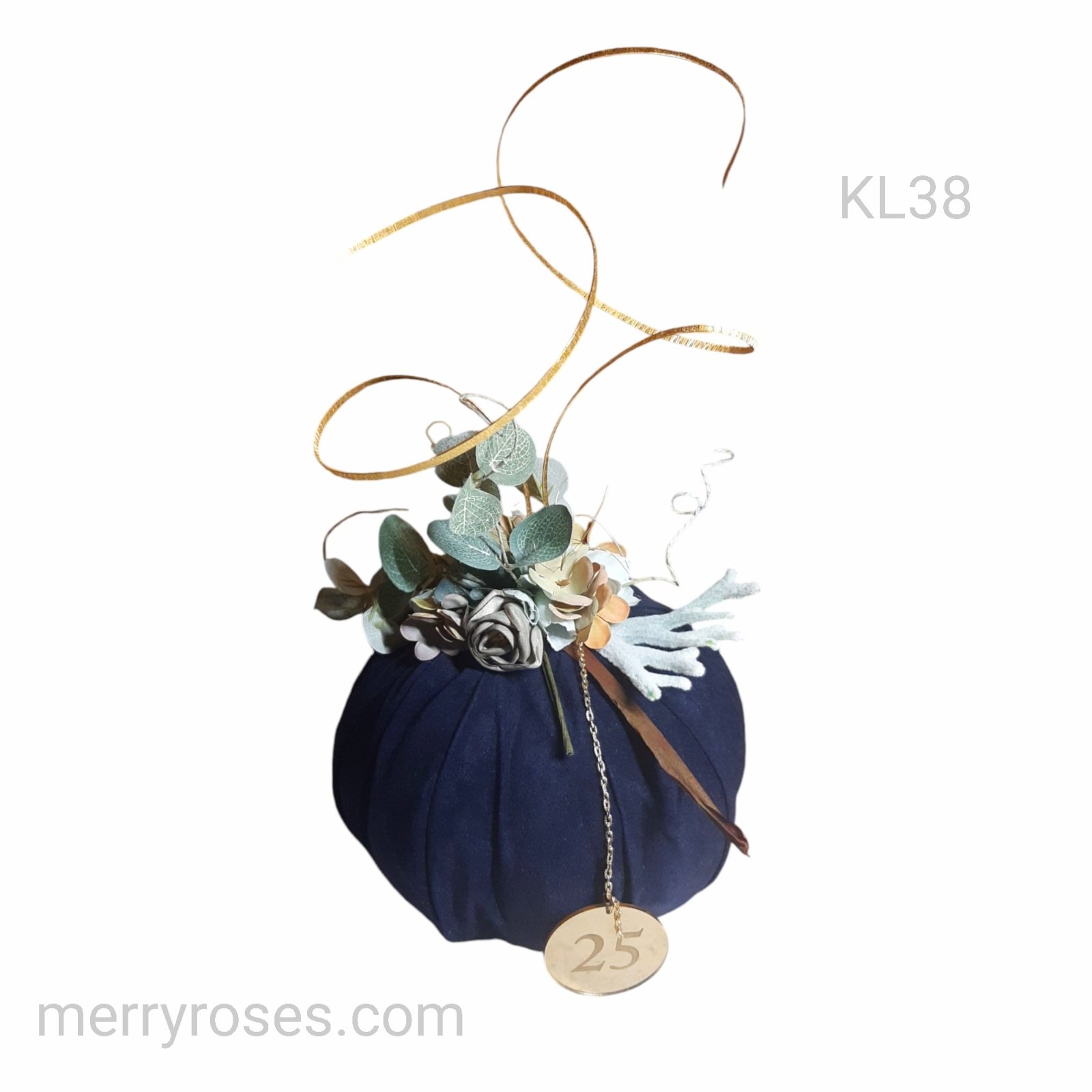Διακοσμητική κολοκύθα βελούδινη μπλε, μεγάλο μέγεθος με σφυρήλατους χρυσούς ράβδους και χρυσό plexi 25