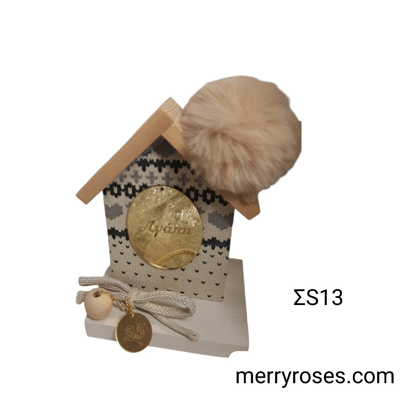 Χριστουγεννιάτικο διακοσμητικό σπιτάκι με χρυσό plexi αγάπη και γούνα.