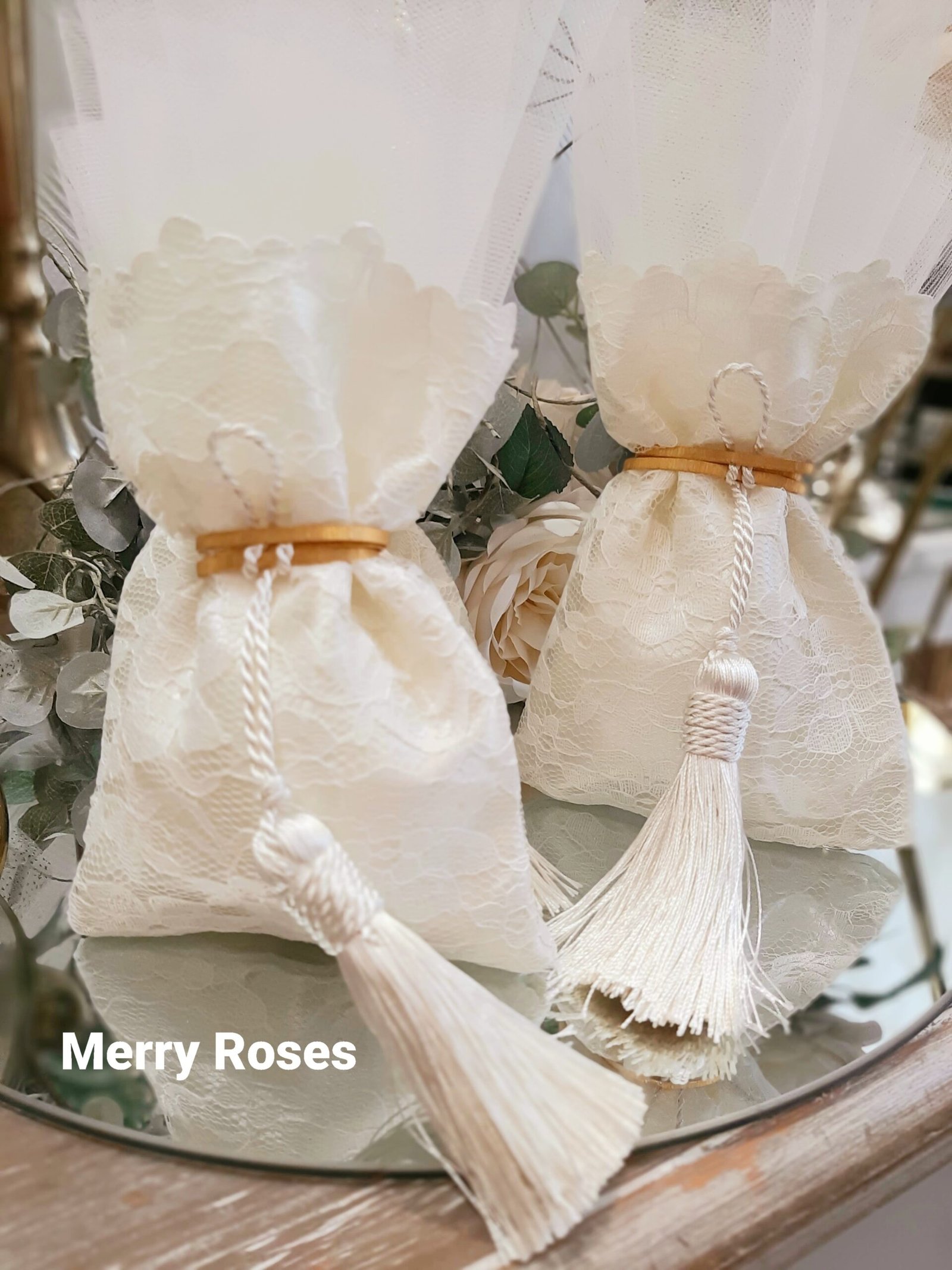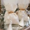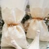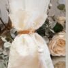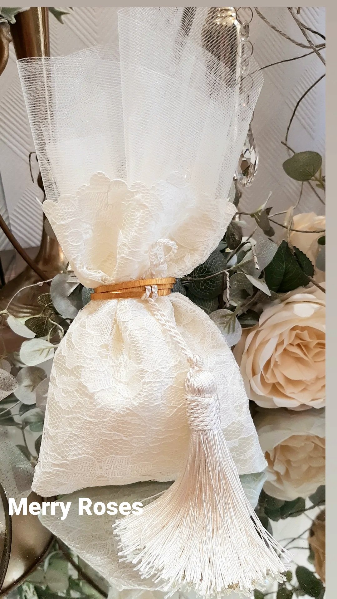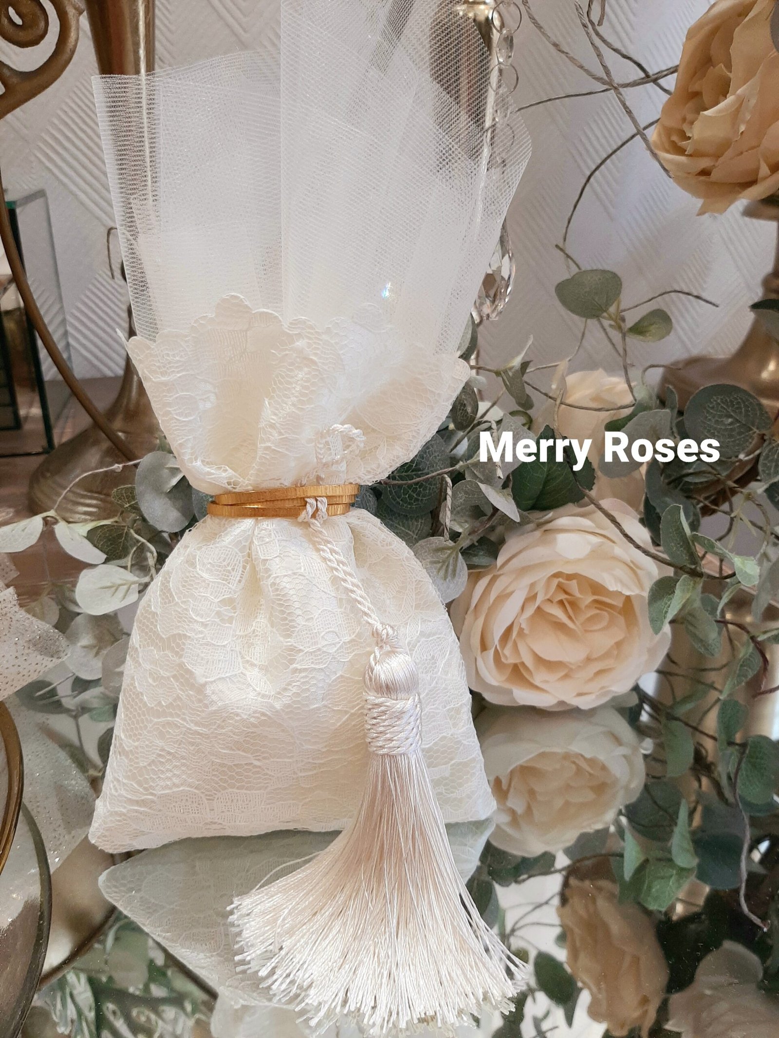 Πολυτελής μπομπονιέρα γάμου εκρού, πουγκί δαντέλας ντουμπλαριστό 13×18εκ,δεμένη με σφυρήλλατη χρυσή ράβδο,και πλούσια εκρού φούντα.
