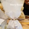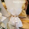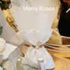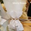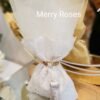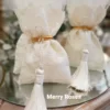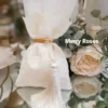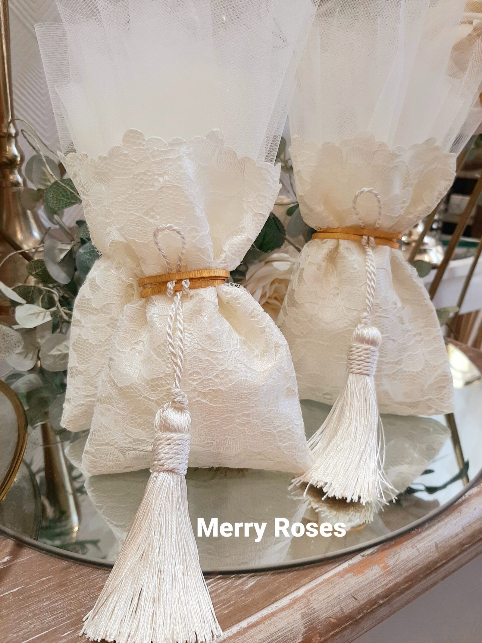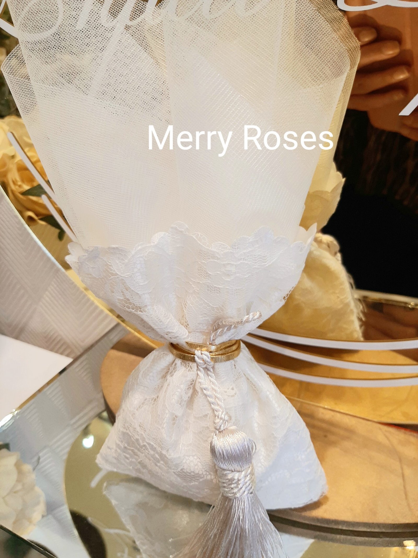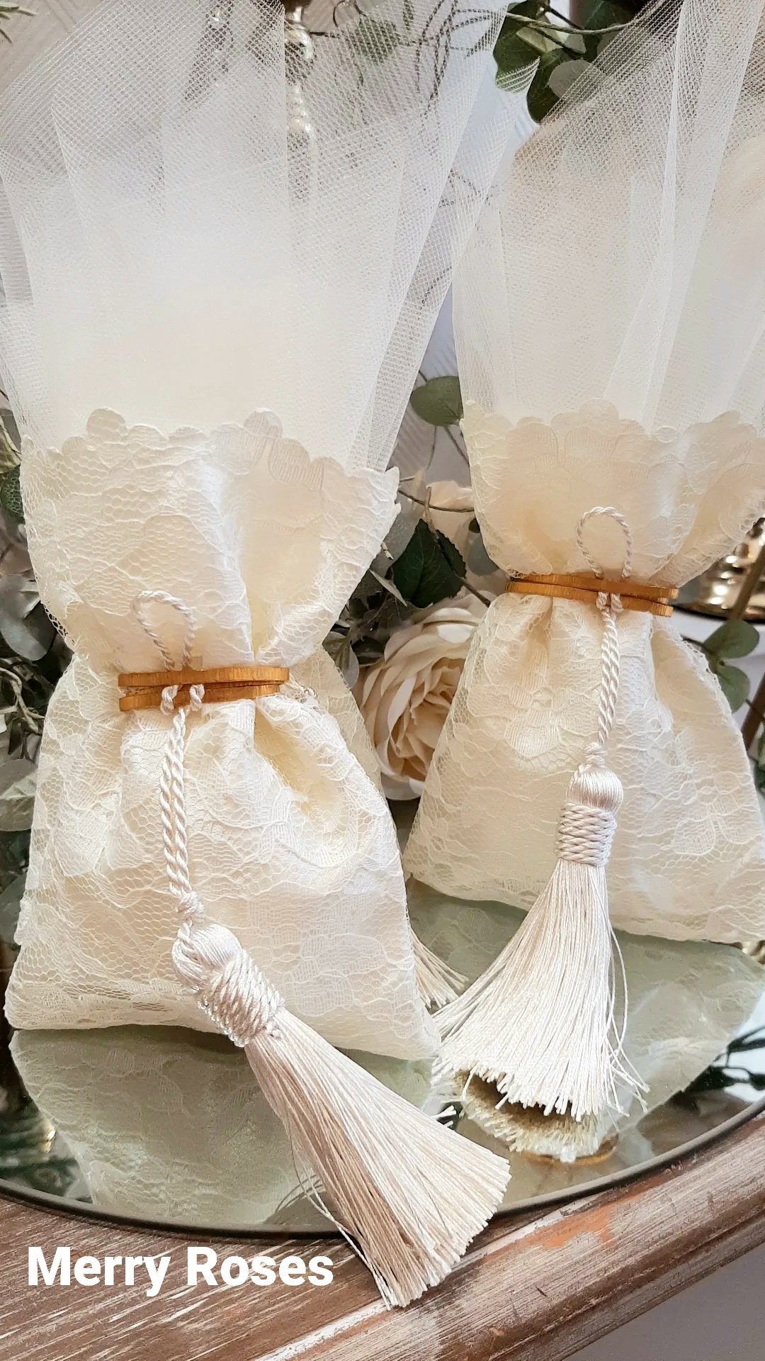 Πολυτελής μπομπονιέρα γάμου εκρού, πουγκί δαντέλας ντουμπλαριστό 13×18εκ,δεμένη με σφυρήλλατη χρυσή ράβδο,και πλούσια εκρού φούντα.