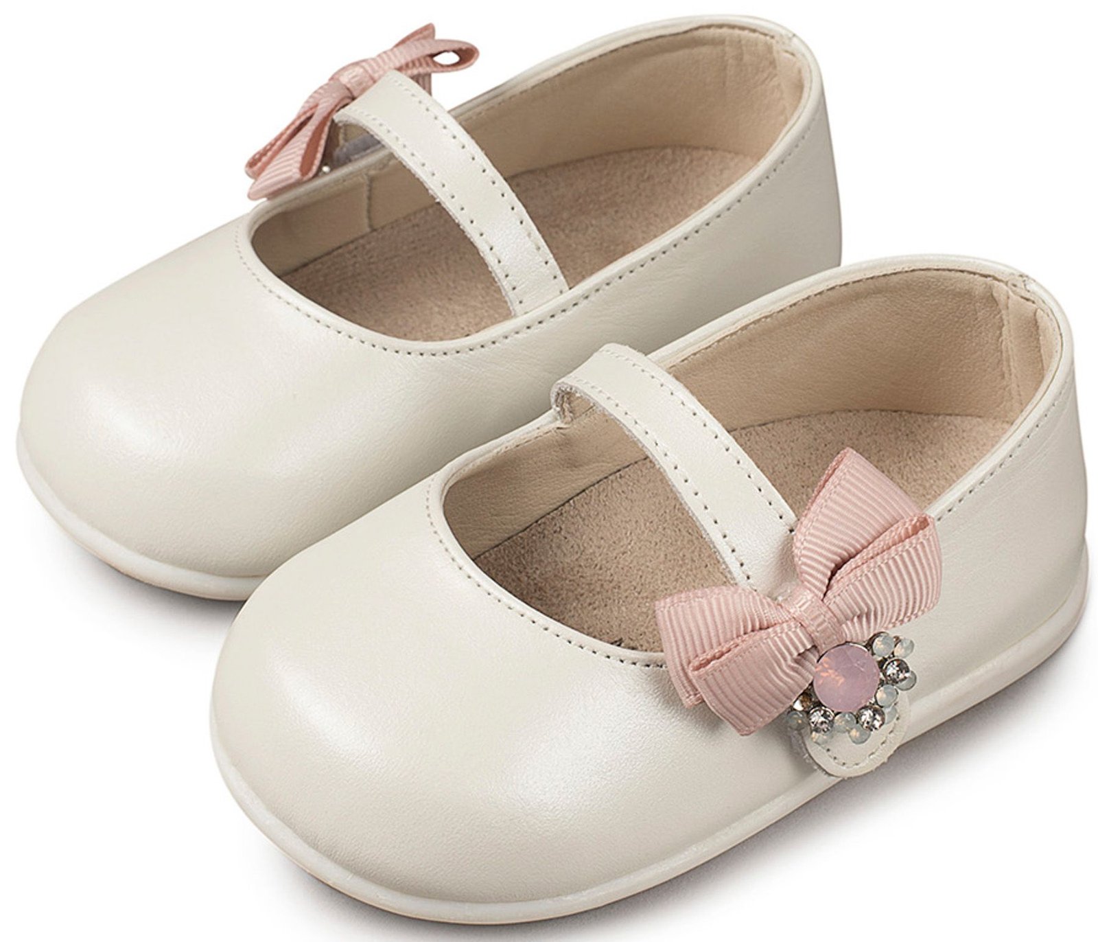 Γοβάκι από περλέ δέρμα, με μονή μπαρέτα διακοσμημένη με ροζ φιογκάκι gros grain και πέρλες, σε εκρού χρώμα.