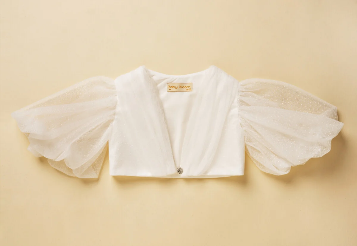 Μπολερό με ντραπε στην λαιμόκοψη και διάφανο μανίκι μπάλουν από τούλι με ψιλό πουά σε off white απόχρωση.