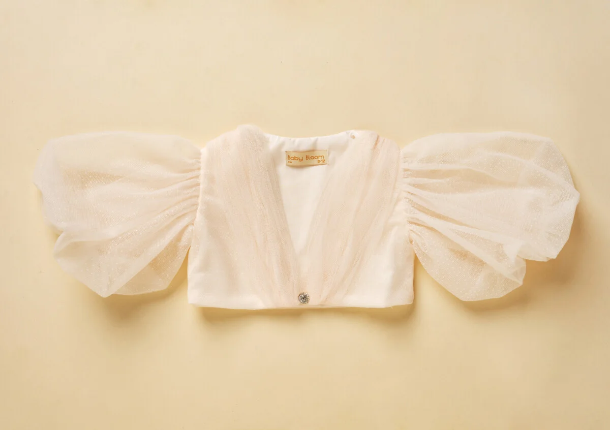Μπολερό με ντραπέ στην λαιμόκοψη και διάφανο μανίκι μπάλουν από τούλι με ψιλό πουά στο χρώμα της πούδρας με εντυπωσιακό κούμπωμα.